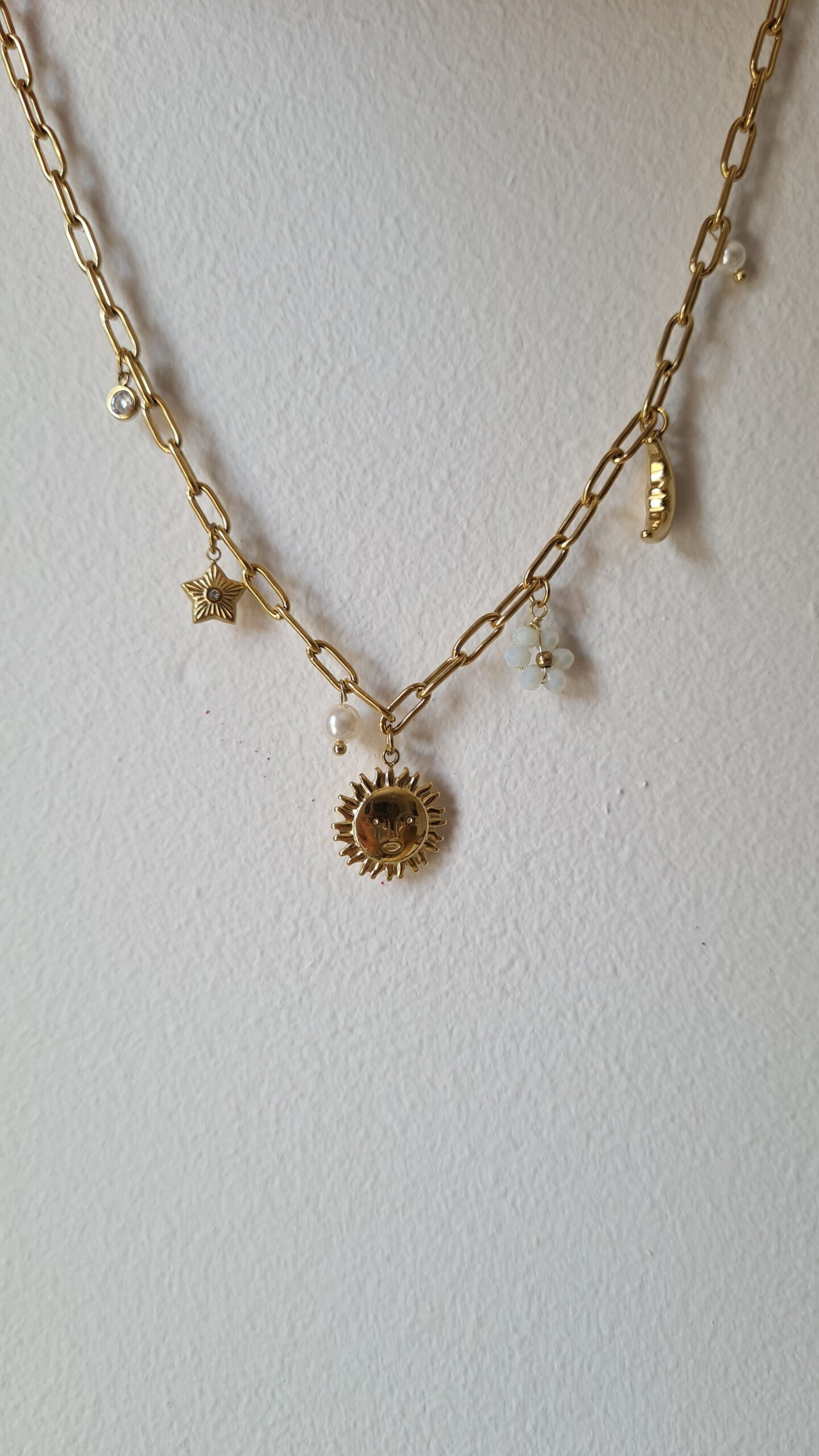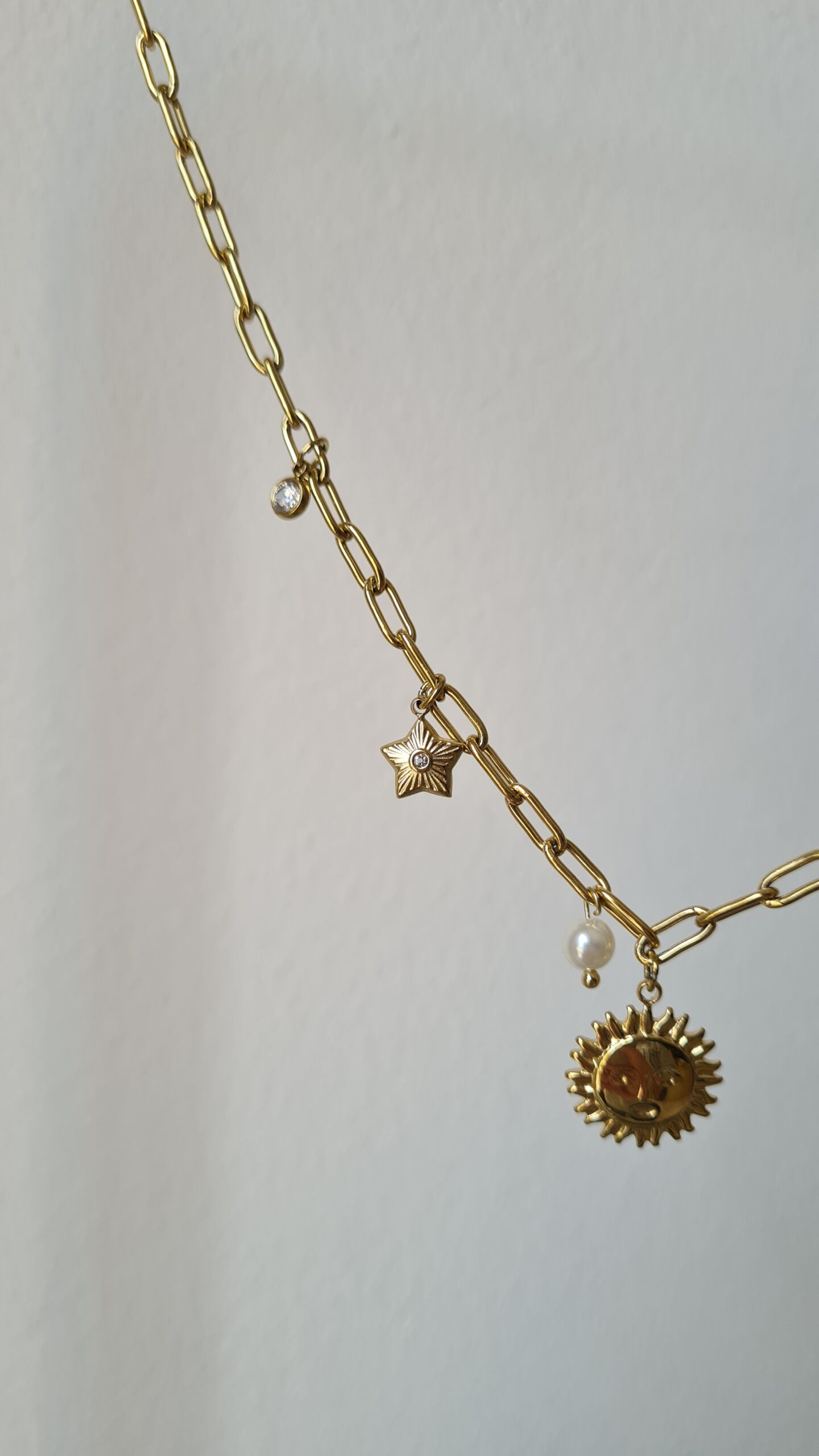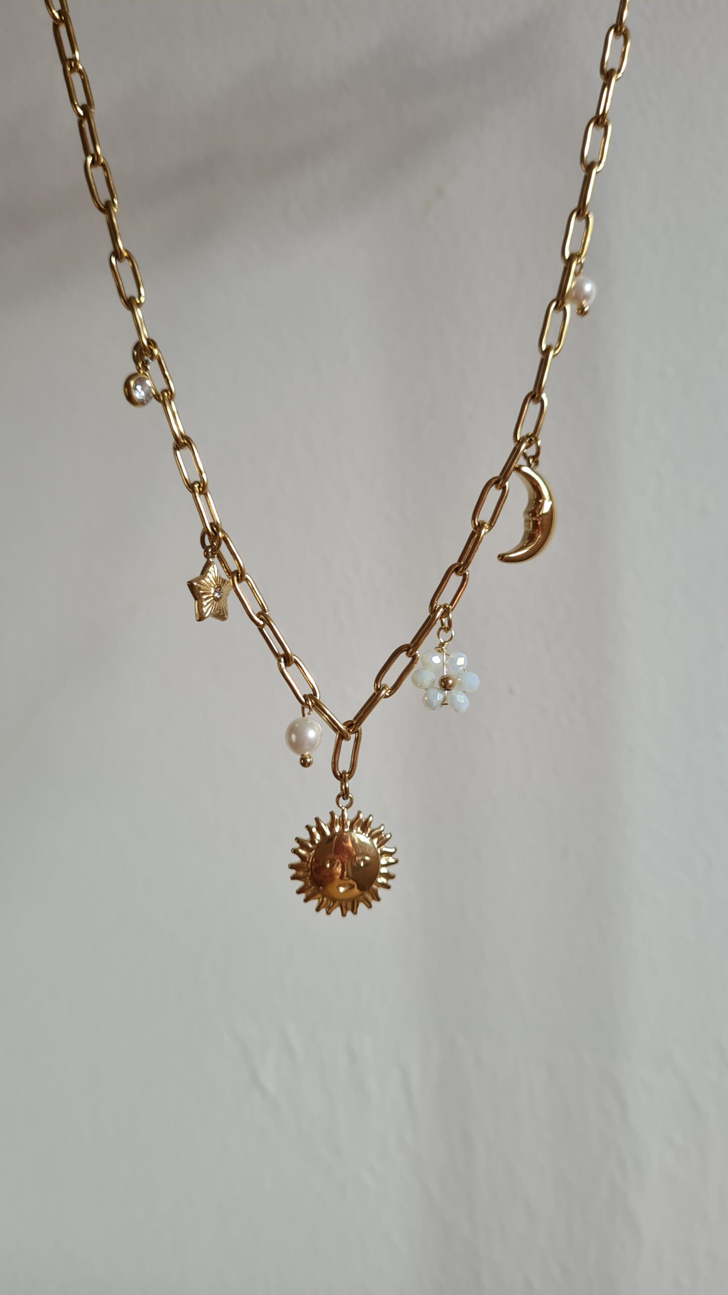 Évoquant le soleil et l’énergie vibrante de l’Espagne, le collier Soléa incarne l’esprit libre, lumineux et audacieux de la femme moderne. Sa chaîne dorée, sublimée par des charms symboliques du soleil et de la lune, ainsi que par de délicates perles, en fait un bijou à la fois puissant et raffiné. Conçu en acier inoxydable waterproof, il résiste au temps et conserve tout son éclat. À porter seul pour un look affirmé ou en accumulation pour un style tendance et unique.