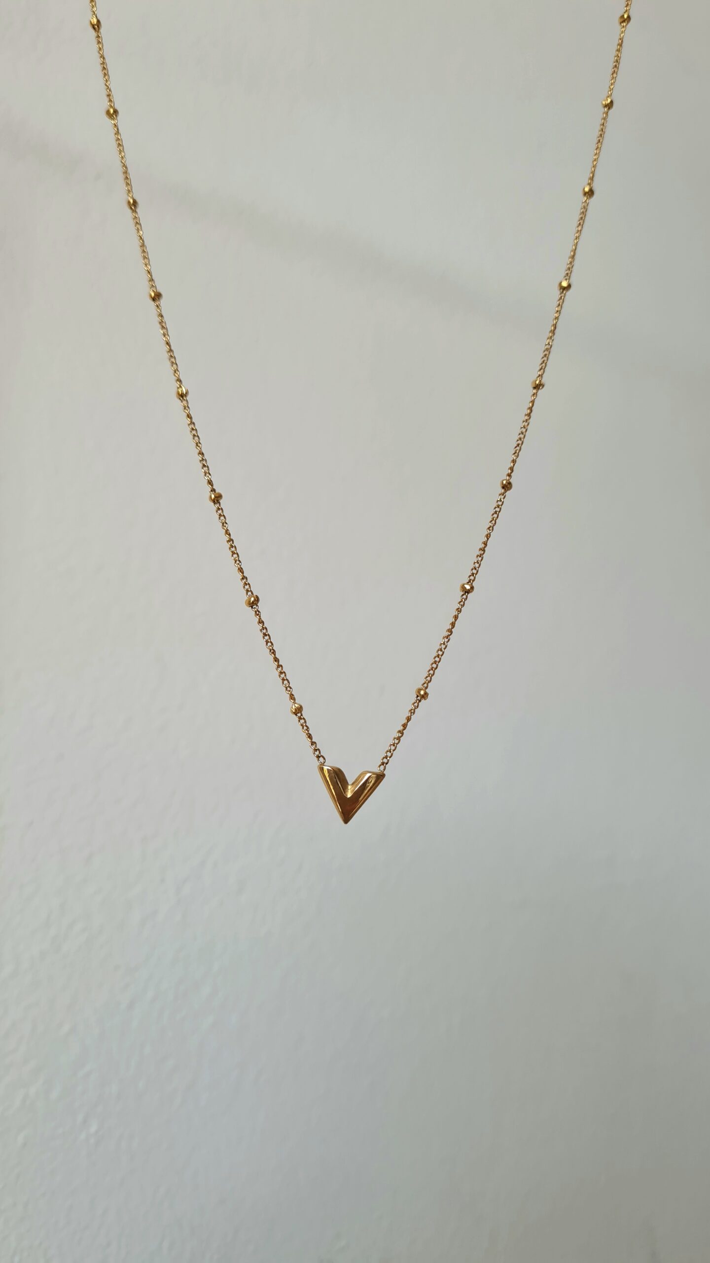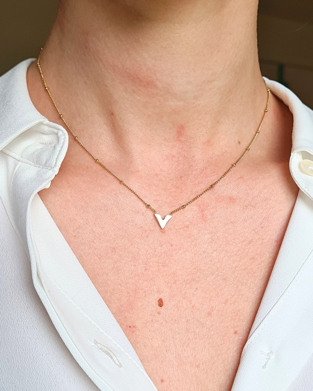 Inspiré du latin verus, signifiant « vrai », le collier Véra célèbre l’authenticité, la simplicité élégante et la force tranquille. Son pendentif en forme de V, délicat et doré, souligne le port de tête avec raffinement et modernité. Minimaliste et chic, ce bijou en acier inoxydable waterproof est conçu pour durer : il ne ternit pas et accompagne vos tenues avec élégance au quotidien ou lors d’occasions spéciales.